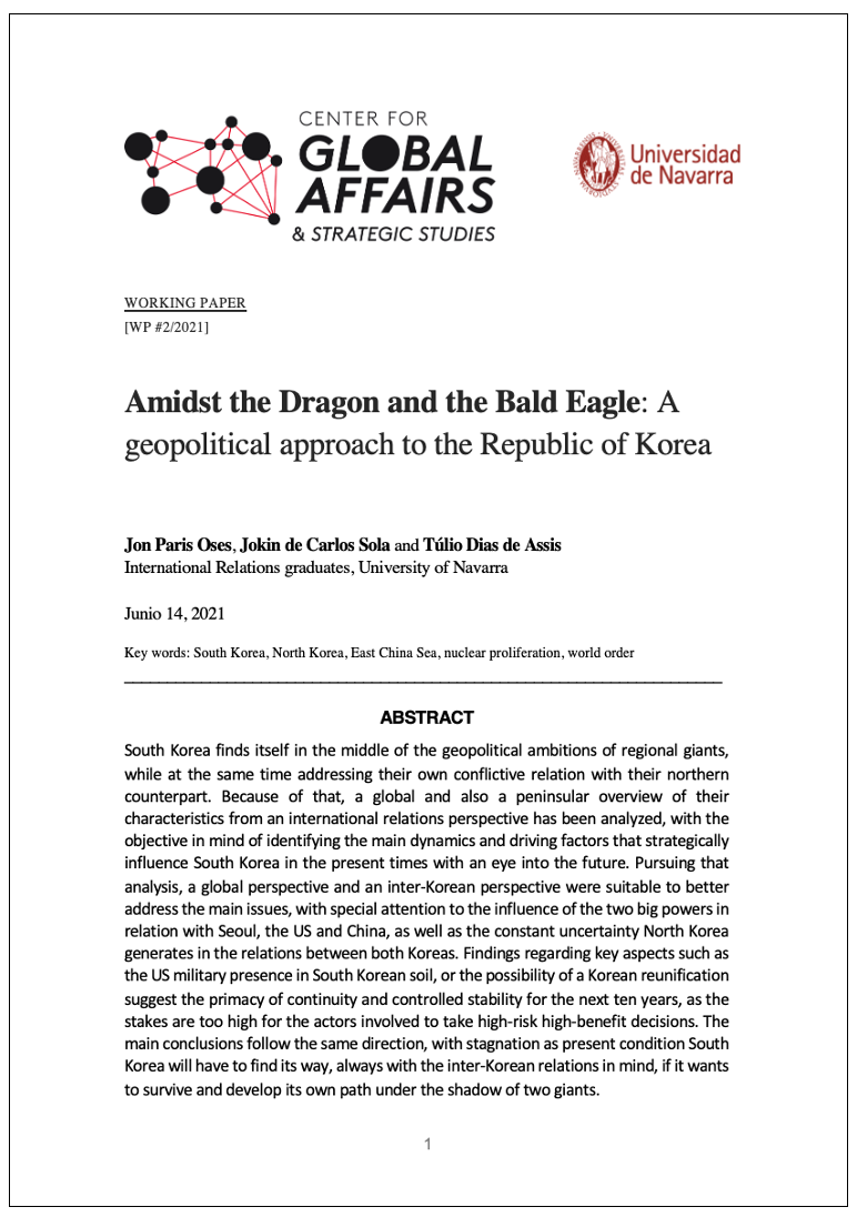 South Korea finds itself in the middle of the geopolitical ambitions of regional giants, while at the same time addressing their own conflictive relation with their northern counterpart. Because of that, a global and also a peninsular overview of their characteristics from an international relations perspective has been analyzed, with the objective in mind of identifying the main dynamics and driving factors that strategically influence South Korea in the present times with an eye into the future. Pursuing that analysis, a global perspective and an inter-Korean perspective were suitable to better address the main issues, with special attention to the influence of the two big powers in relation with Seoul, the US and China, as well as the constant uncertainty North Korea generates in the relations between both Koreas. Findings regarding key aspects such as the US military presence in South Korean soil, or the possibility of a Korean reunification suggest the primacy of continuity and controlled stability for the next ten years, as the stakes are too high for the actors involved to take high-risk high-benefit decisions. The main conclusions follow the same direction, with stagnation as present condition South Korea will have to find its way, always with the inter-Korean relations in mind, if it wants to survive and develop its own path under the shadow of two giants.